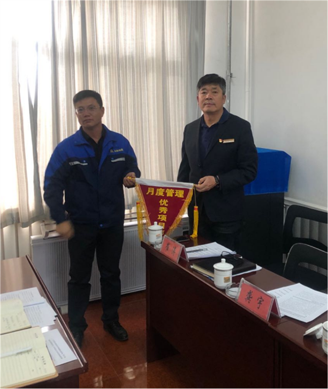 城建公司副總經(jīng)理龔宇為第二名頒發(fā)《月度管理優(yōu)秀項目部》榮譽稱號(圖左城建公司副總經(jīng)理吳??;圖右項目經(jīng)理付文寧)
